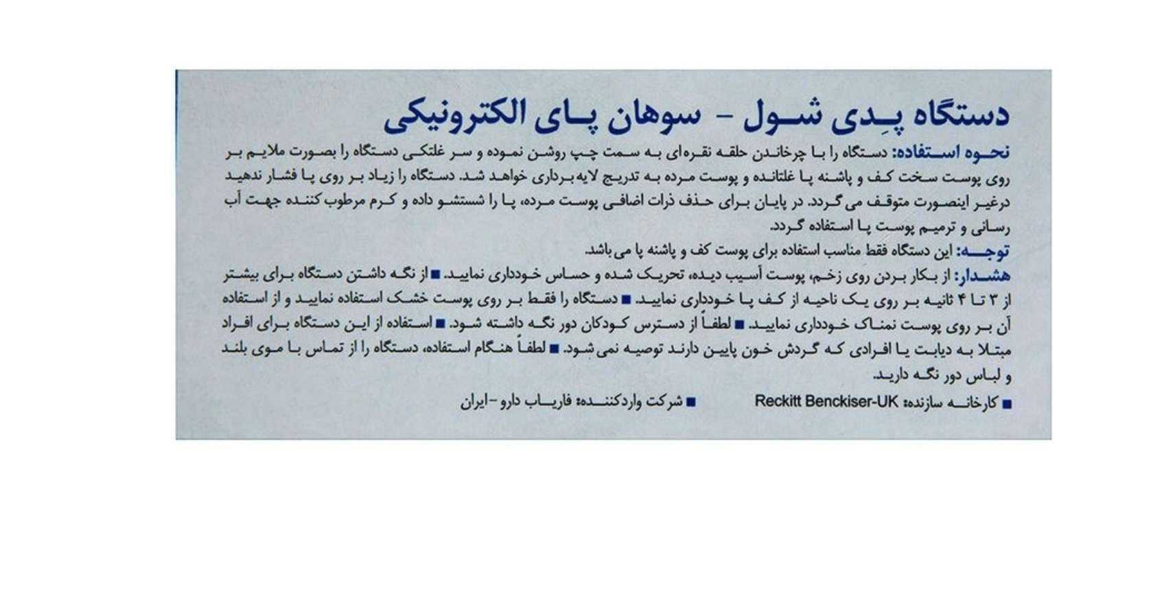 - مناسب برای حذف ذرات اضافی پوست مرده کف و پاشنهی پا - دارای کلید چرخشی روشن/خاموش - دارای سوهان قابل تعویض - سوهان دارای ذرات ریز کریستالی - منبع انرژی: باتری قلمی - طراحی ارگونومیک - وزن: 300 گرم اقلام همراه: - 4 عدد باتری قلمی - پوشش محافظ - مناسب افراد با پوست معمولی